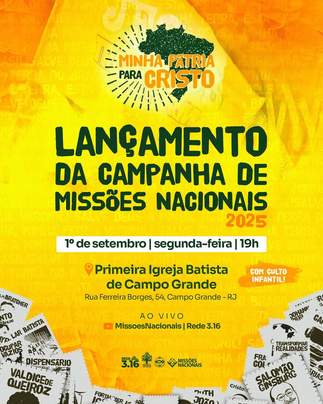 Vamos realizar um grande culto de lançamento no dia 1º de setembro, às 19h, na Primeira Igreja Batista de Campo Grande (RJ). Se não puder estar presente, acompanhe ao vivo pelo canal do YouTube de Missões Nacionais ou da Rede 3.16.